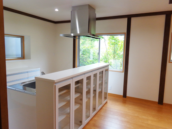 キッチンはアイランドとし、家事動線を考慮しました。また、奥様の好きなグラスを飾れるよう食器棚を造作して収納を設けました。寝室は増築し、ウォークインクローゼットを設置しました。床フロアーはペットの3匹の犬のためにワンラブフロアーとしました。 |