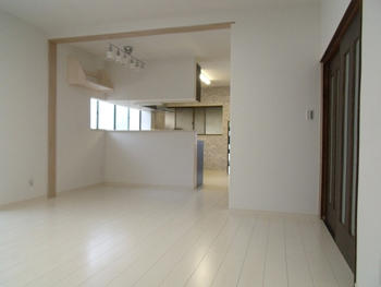 別々の部屋だった居間とキッチンを1つの広い部屋にしました。天井と壁際に取り付ける廻り縁を無しにし、明るくスッキリとしたインテリアをご提案しました。 |