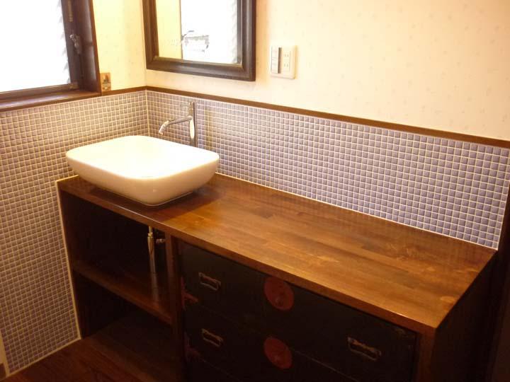 洗面所のカウンターはアンティークな雰囲気のタンスの入る高さで手作りし、塗装をしました。 |