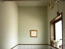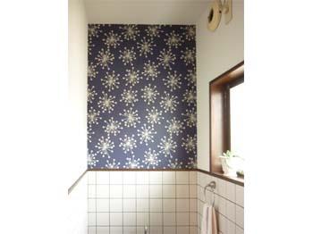 | カウンターは手作りで塗装を施しました。その上に洗面ボールを乗せてすっきりした感じに仕上がりました。カウンターの下にはアンティーク風のタンスを入れ、洗面の正面と側面にはモザイクタイルでアクセントを付けました。 | トイレのクロスは一面柄のクロスでオシャレに仕上げました。 |
