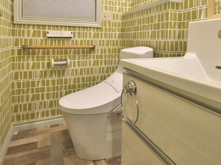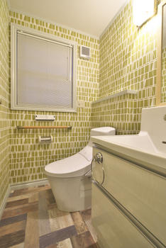 トイレと洗面を一部屋にすることで広く使えます。壁のクロスと床のCFシートははデザイナーズシリーズで思い切ったデザインを提案しました。 |