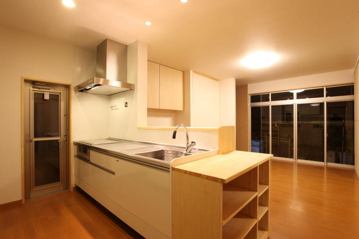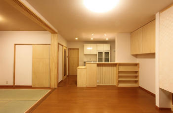 増築するのではなく、内部の壁を撤去して間取り変更を提案しました。結果的にコストが削減され、」必要な場所に資金を集中させる事ができました。既存の欄間を再利用して壁に埋め込んだのはとても喜んでいただきました。 |